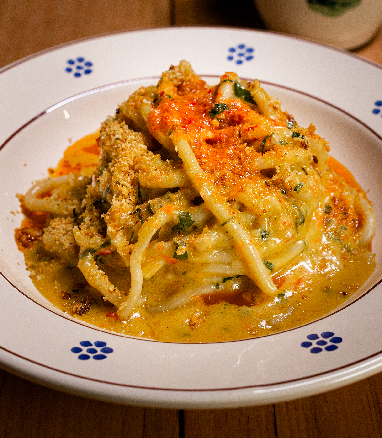 - ORECCHIETTE 'nduja e salsiccia (GFO)Homemade orecchiette cooked in white wine and spicy 'nduja sauce, served with fennel seed pork sausage, topped with fresh burrata and fennel breadcrumbs$26