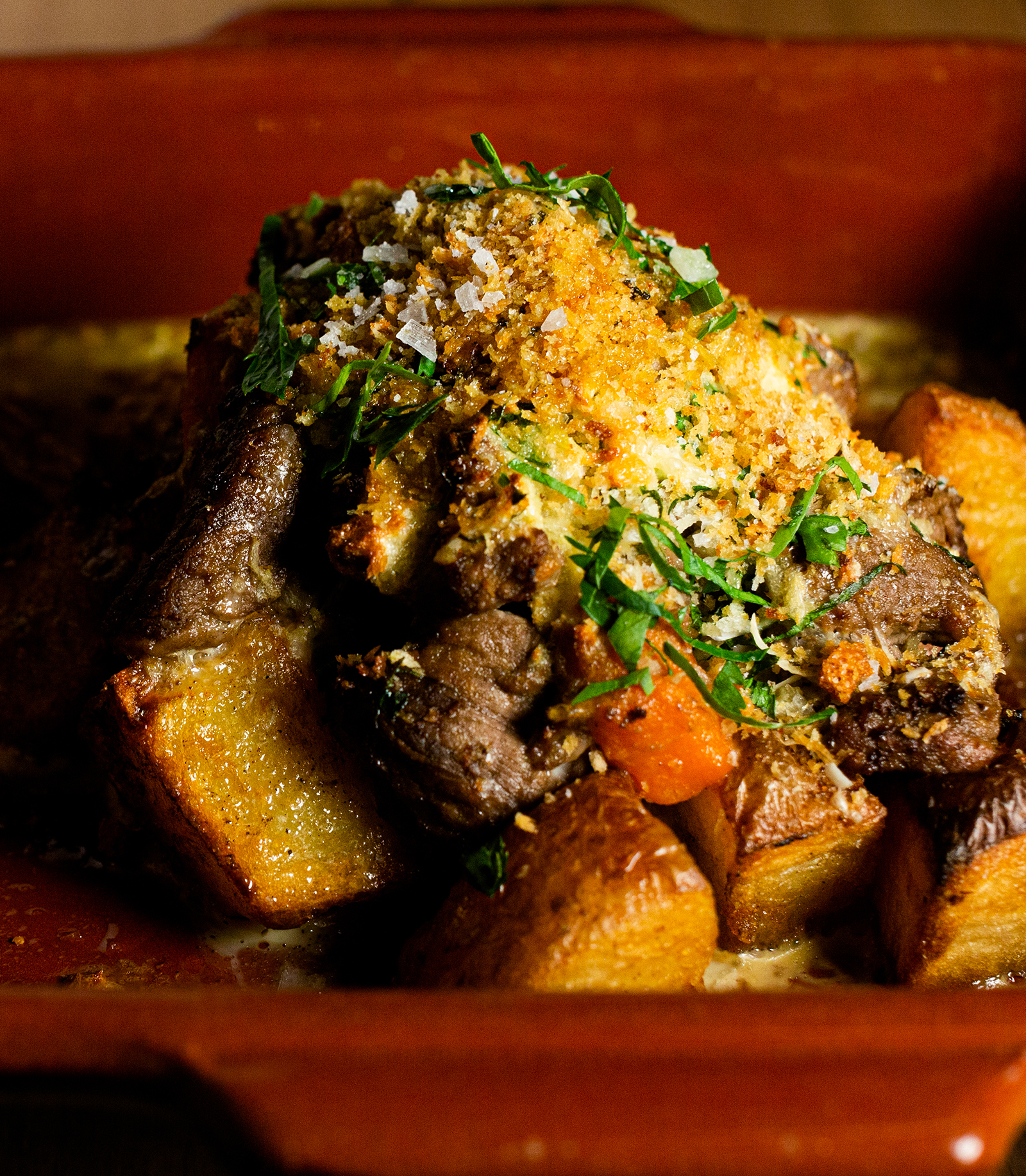 - PECURIEDDHRU RAGANATU200gr diced lamb shoulder, baked with potatoes, bitten eggs and pecorino cheese, topped with breadcrumb$30