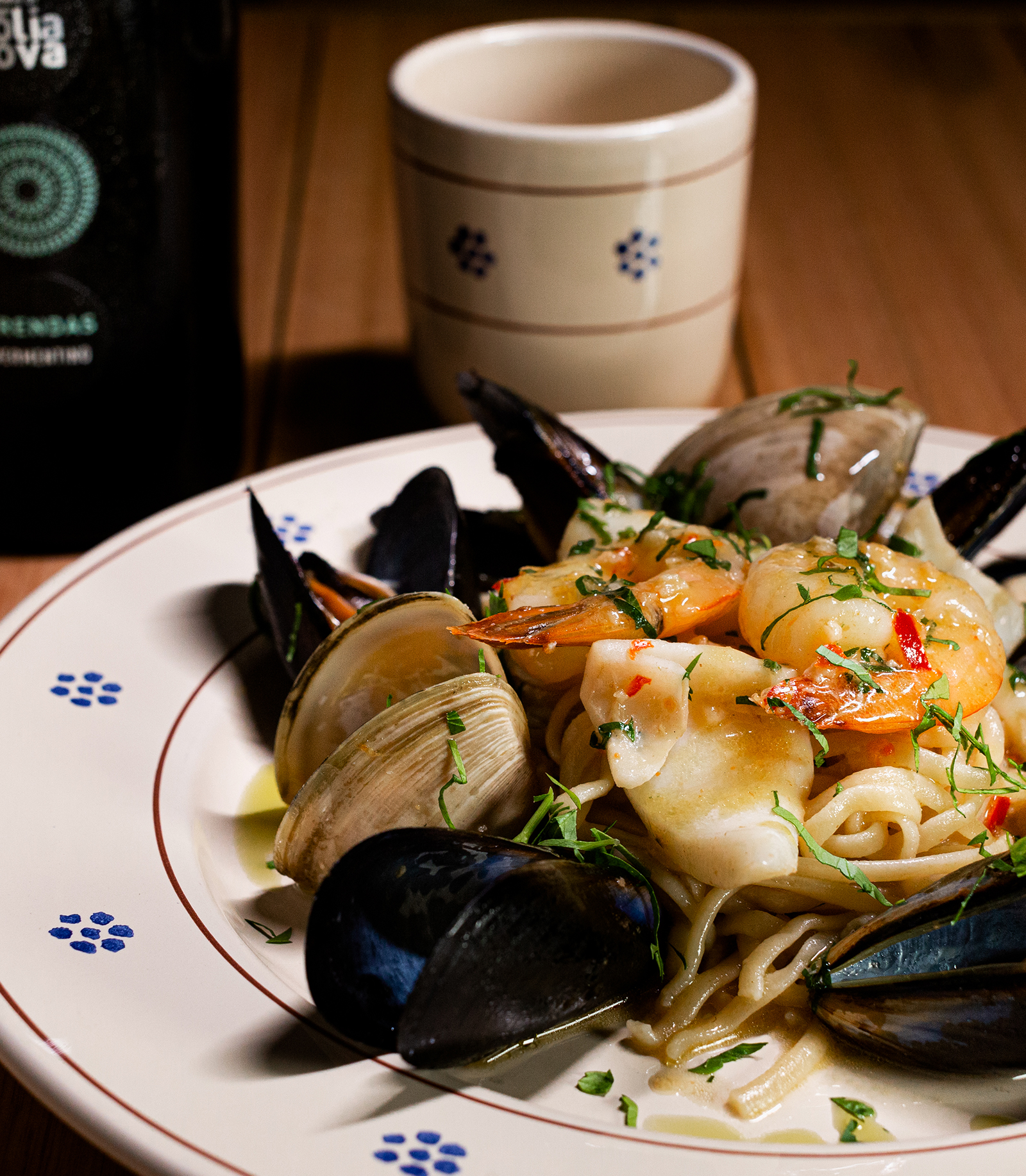 - LINGUINE ALLO SCOGLIO (GFO)Homemade linguine, mussels, clams, squid and prawn cutlets, cooked with EVOO, white wine, chilli and garlic$27